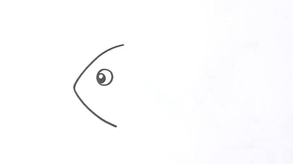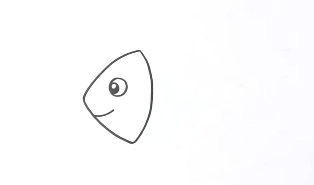 Curve a small smile near the left point to suggest a friendly mouth. Then refine the head’s back edge: trace a slightly straighter line on the right side to flatten the profile a touch. Keep the eye centered between top and bottom arcs. Erase stray marks, keeping the outer contour clear and even so your fish reads simple, cute, and to ink.