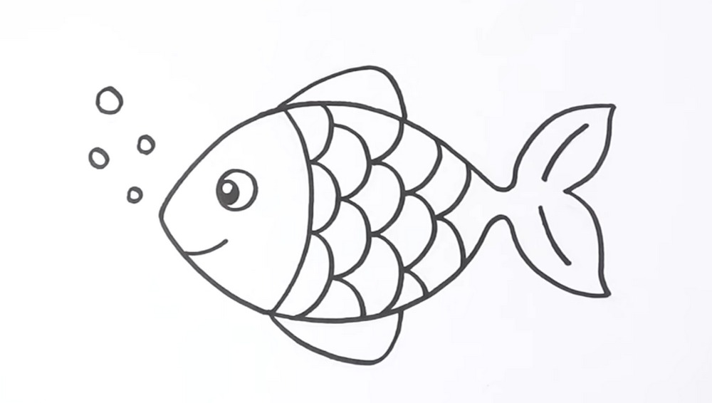 Finish with details. Add two light curved lines inside the tail lobes to suggest structure. Draw a few round bubbles drifting upward near the nose for a playful touch. Now trace your final outline with a pen or darker pencil, letting the clean line pass smoothly around curves. Erase construction marks when dry. Your friendly fish is ready for color or shading.